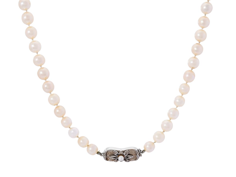 PÄRLCOLLIER, odlade saltvattenspärlor ca 8,0 - 8,5 mm, lås i 18K vitguld, rosenslipade diamanter, odlad pärla, längd 45 cm, vikt 39,3 g, en pärla har bytts ut mot en sötvattenspärla, i behov av omträdning.