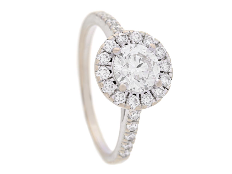 RING, 18K vitguld, briljantslipad diamant ca 0,71 ct, ca TCr(I)/VS1, briljantslipade diamanter ca 0,34 ctv, ca TW-W/VS, stl 17+ mm, vikt 3,6 g.