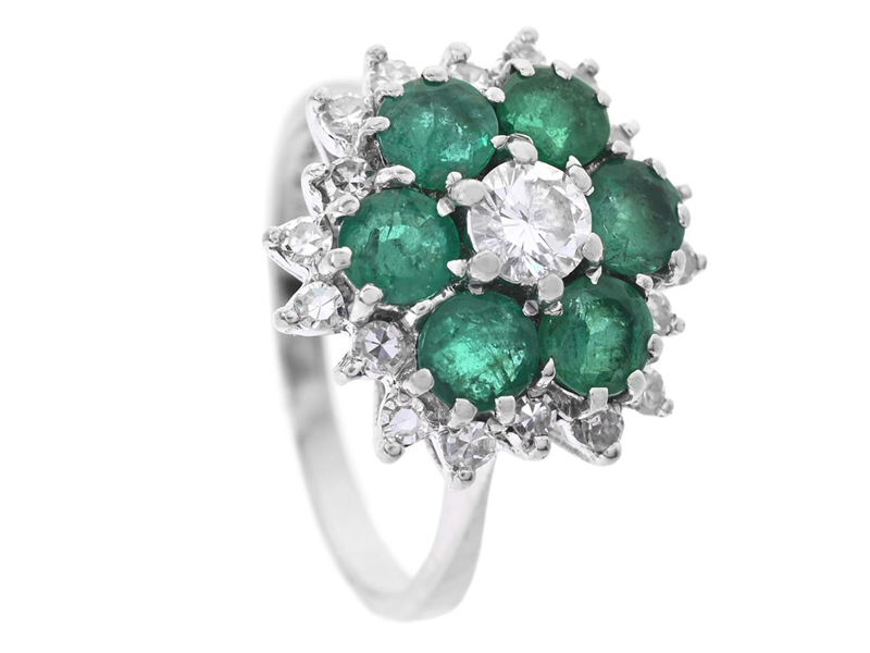 RING, 18K vitguld, smaragder, briljantslipad diamant ca 0,23 ct, ca W/VS, åttkantslipade diamanter ca 0,27 ctv, ca W/VS, stl 16,5 mm, 5,3 g, en smaragd med nagg.