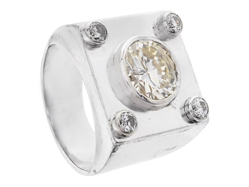 KLACKRING, 14K vitguld, briljantslipad diamant ca 2,80 ct, ca Light Yellow(O-P)/VS2, 4 briljantslipade diamanter ca 0,40 ctv, ca W-Cr/VS-P, stl 17,5 mm, vikt 11,1 g, nickelplätterad, mittstenen har kulettfasett och inverterade naturaler vid rondisten.