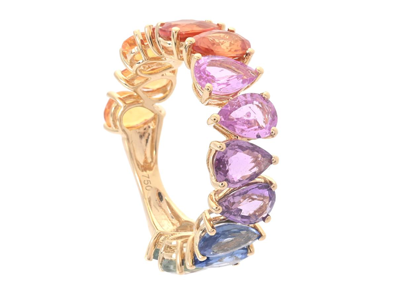 RING, 18K guld, droppslipade flerfärgade behandlade safirer ca 6,62 ctv, stl 16,75 mm, vikt 3,6 g.
