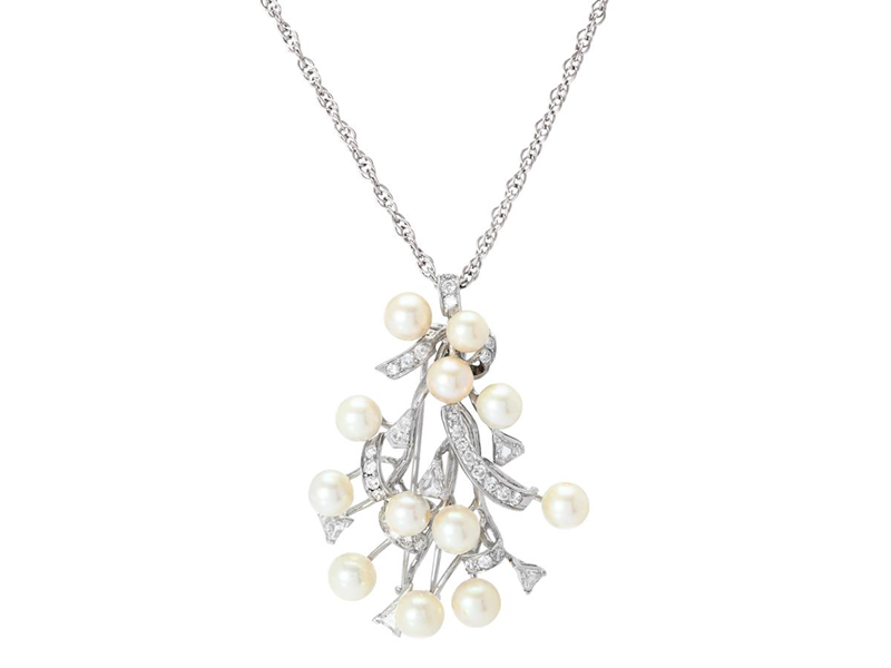 HÄNGE/BROSCH, 11-14K vitguld, diamanter, odlade pärlor, en diamant saknas, kedjan är i nickel, vikt 21,5 g.