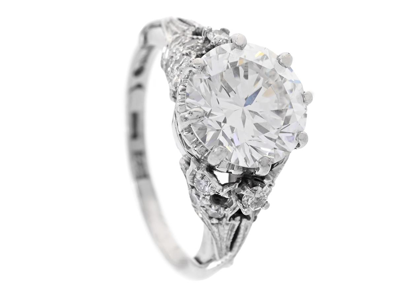 RING, 18K vitguld, briljantslipad diamant ca 2,31 ct, ca W(H)/VVS1, 17 briljantslipade diamanter ca 0,28 ctv, ca W-TCr/VS, Lawepe Ängby Smycken, Stockholm 1974, stl 16 mm, vikt 4,6 g, 1 diamant saknas, mittstenen med liten kulettfasett, gravyr.