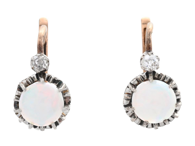 ÖRHÄNGEN, 18K guld/platina, cabochonslipade opaler, antikslipade diamanter, höjd 1,5 cm, vikt ca 3,5 g, diamanterna har nagg, en opal med sprickbildning, missfärgning på guldet.