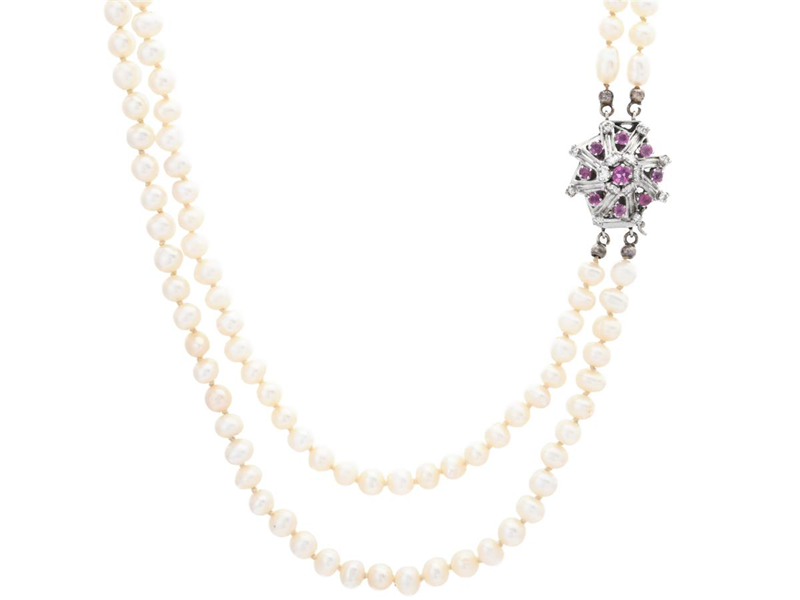 PÄRLCOLLIER, tvåradig, odlade barocka sötvattenspärlor, lås i 18K vitguld, rundslipade rubiner, åttkant- och briljantslipade diamanter ca 0,30, ca W-TCr/SI, längd ca 47 cm, vikt 41,1 g, svaga fattningar, rubiner med nagg.