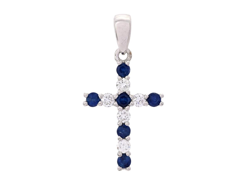 HÄNGE, 18K vitguld, kors, 6 runda fasettslipade blå safirer ca 0,15 ctv, 5 briljantslipade diamanter ca 0,09 ctv, ca W/SI-P, höjd 13,0 mm, bredd 9,0 mm, vikt 0,5 g.