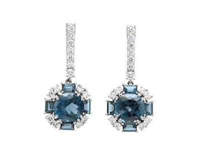 ÖRHÄNGEN, 18K vitguld, behandlade blå briljantslipade diamanter ca 0,37 ctv, ca SI-P, stift, vikt 1,9 g, skrapmärken i guldet.