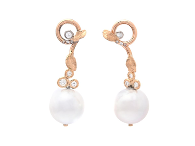 MANDELSTAM, pärlörhängen, 18K vitguld, Southsea pärlor 15 mm, rosa turmaliner 1,30 ctv, briljantslipade diamanter 0,55 ctv, höjd 50 mm, vikt 13,4 g, originaletui.