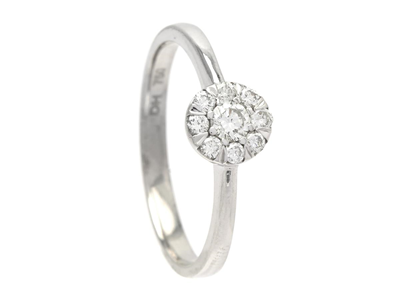 RING, 18K vitguld, briljantslipad diamant 0,40 ct, TW(F)/VS2, GIA Diamond Dossier 2476948132, 14 briljantslipade diamanter ca 0,23 ctv, ca TW-W/VS, storlek 17,5 mm, vikt 3,0 g.